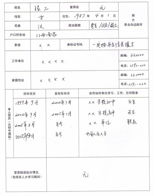 1、沒有的項目填寫“無”不得空項;如有工作單位,職務一欄就不能填寫“無”