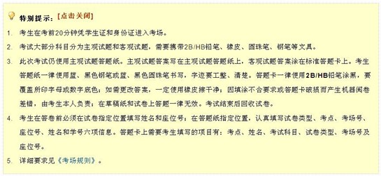 6.考前請仔細閱讀考場安排查詢欄目下的“注意事項”和“特別提醒”,詳見下圖: