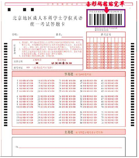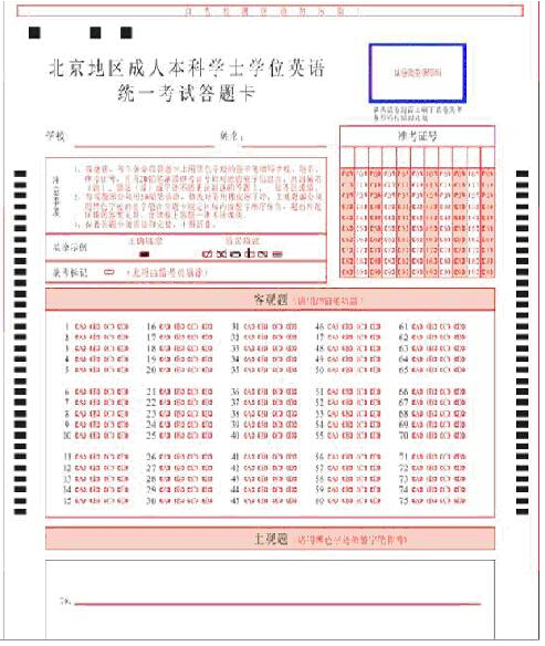 從08年4月開始北京地區成人本科學士學位英語統一考試實行網上閱卷,且從2013年5月開始學位英語考試開始實施“一題多卷”,即考試試題相同,題目順序被打亂,使用相同的答題卡,以試卷上的條形碼為區分。 (考生拿到試卷和答題卡后,請從試卷封面取下試卷類型條形碼,粘貼到答題卡指定位置。)新的試卷樣式見所附圖片:北京地區成人本科學士學位英語統一考試試卷(樣式)。