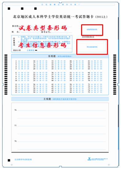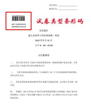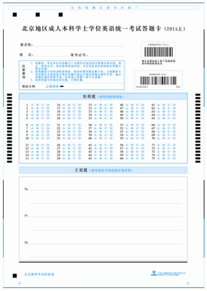 從2008年4月開(kāi)始北京地區(qū)成人本科學(xué)士學(xué)位英語(yǔ)統(tǒng)一考試實(shí)行網(wǎng)上閱卷,且從2013年5月開(kāi)始學(xué)位英語(yǔ)考試開(kāi)始實(shí)施“一題多卷”,即考試試題相同,題目順序被打亂,使用相同的答題卡,以試卷上的條形碼為區(qū)分。 (考生拿到試卷和答題卡后,請(qǐng)從試卷封面取下試卷類型條形碼粘貼到答題卡指定位置。)另從2015年5月開(kāi)始學(xué)位英語(yǔ)考試開(kāi)始實(shí)行在答題卡上粘貼“考生信息條形碼”,請(qǐng)考生拿到考生信息條形碼后一并粘貼到答題卡指定位置。新的試卷樣式見(jiàn)所附圖片:北京地區(qū)成人本科學(xué)士學(xué)位英語(yǔ)統(tǒng)一考試試卷(樣式)。