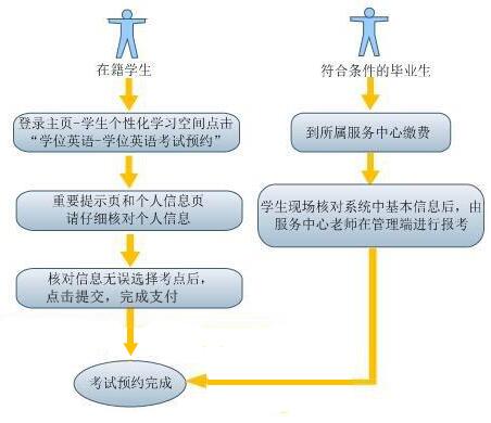 在籍學(xué)生需要在個性化學(xué)習(xí)空間中自行預(yù)約考試并交費;畢業(yè)后兩年內(nèi)的本科層次學(xué)生若除學(xué)位英語外,其它條件都符合申請學(xué)士學(xué)位的條件,可由所屬服務(wù)中心代為預(yù)約,考試費用需要交到服務(wù)中心。