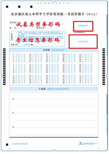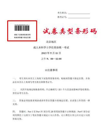 從2008年4月開始北京地區(qū)成人本科學(xué)士學(xué)位英語統(tǒng)一考試實(shí)行網(wǎng)上閱卷,且從2013年5月開始學(xué)位英語考試開始實(shí)施“一題多卷”,即考試試題相同,題目順序被打亂,使用相同的答題卡,以試卷上的條形碼為區(qū)分。 (考生拿到試卷和答題卡后,請從試卷封面取下試卷類型條形碼粘貼到答題卡指定位置。)另從2015年5月開始學(xué)位英語考試開始實(shí)行在答題卡上粘貼“考生信息條形碼”,請考生拿到考生信息條形碼后一并粘貼到答題卡指定位置。新的試卷樣式見所附圖片:北京地區(qū)成人本科學(xué)士學(xué)位英語統(tǒng)一考試試卷(樣式)。