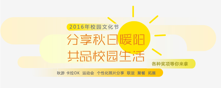 “分享秋日暖陽,共品校園生活”,秋游,徒步,參觀,卡拉OK,運動會,聯誼,聚餐,拓展,個性化照片分享......我們相約2016年校園文化節,各種獎項等你來拿。