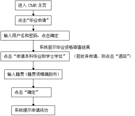 - 符合畢業條件的學生須在2009年8月11日9點至8月24日中午12點之前在網上提交畢業申請。首先點擊CMR主頁左上角的“學員通道”中的“畢業申請”,鍵入用戶名和密碼后,系統自動進行畢業資格審查,并顯示審查結果。現以符合畢業和學位申請條件的學生為例來詳細說明畢業申請流程: