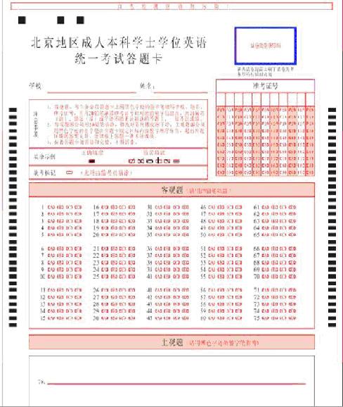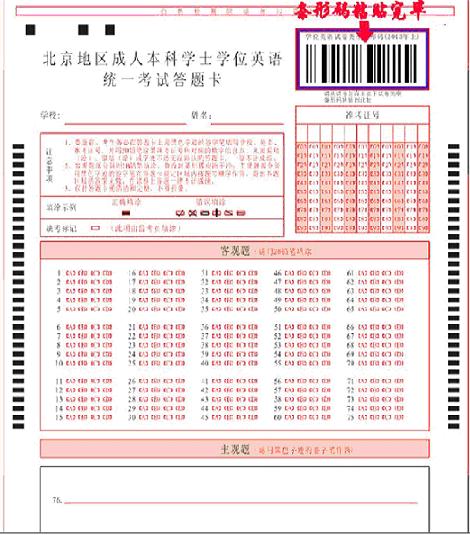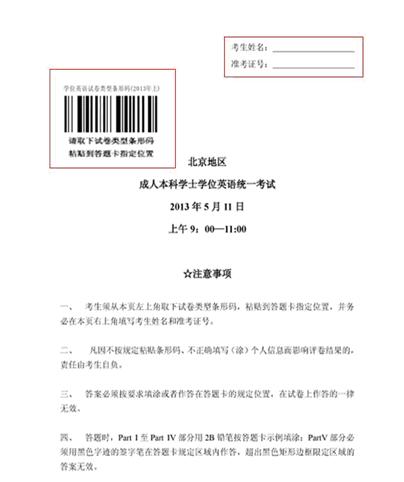 從08年4月開始北京地區成人本科學士學位英語統一考試實行網上閱卷,且從2013年5月開始學位英語考試開始實施“一題多卷”,即考試試題相同,題目順序被打亂,使用相同的答題卡,以試卷上的條形碼為區分。 (考生拿到試卷和答題卡后,請從試卷封面取下試卷類型條形碼,粘貼到答題卡指定位置。)新的試卷樣式見所附圖片:北京地區成人本科學士學位英語統一考試試卷(樣式)。