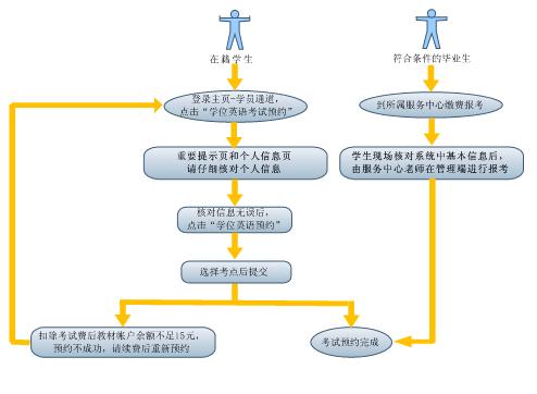 在籍學(xué)生需要在學(xué)院主頁自行預(yù)約考試,考試費(fèi)用將從教材費(fèi)中扣除;畢業(yè)后兩年內(nèi)的本科層次學(xué)生若除學(xué)位英語外,其它條件都符合申請學(xué)士學(xué)位的條件,可由所屬服務(wù)中心代為預(yù)約,考試費(fèi)用需要交到服務(wù)中心。