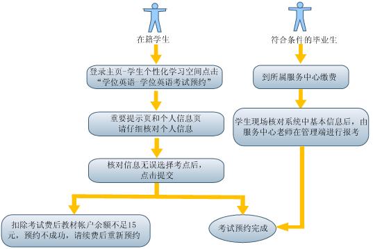 在籍學生需要在學院主頁自行預約考試,考試費用將從教材費中扣除;畢業(yè)后兩年內(nèi)的本科層次學生若除學位英語外,其它條件都符合申請學士學位的條件,可由所屬服務中心代為預約,考試費用需要交到服務中心。