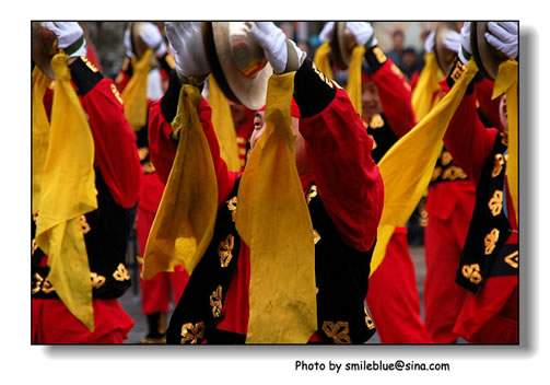 ?? 九點過,威風鑼鼓齊響,社火表演正式開始了!游行表演的隊伍就在大街上,依次路過主席臺,在臺前停留、演出。街道兩旁擠滿了壓壓的觀眾,大多是蔚縣的父老鄉親,被安全帶攔截開去,有多名警力在維護秩序。或許當年蔚縣社火還不夠出名,當天像我們這樣的外來戶不算多,且因為同行的朋友們都背著大鏡頭的單反相機,一概被當地組織方當做記者特許放入街道里,可以在主席臺前穿行在游行隊伍中隨意拍照,這機遇實在是很難得!狂拍了無數照片,大家都回來發帖發圖,后來蔚縣社火的名聲大了,近年再去的朋友們就不能再隨意進入游行隊伍拍攝了,頗有些遺憾。
